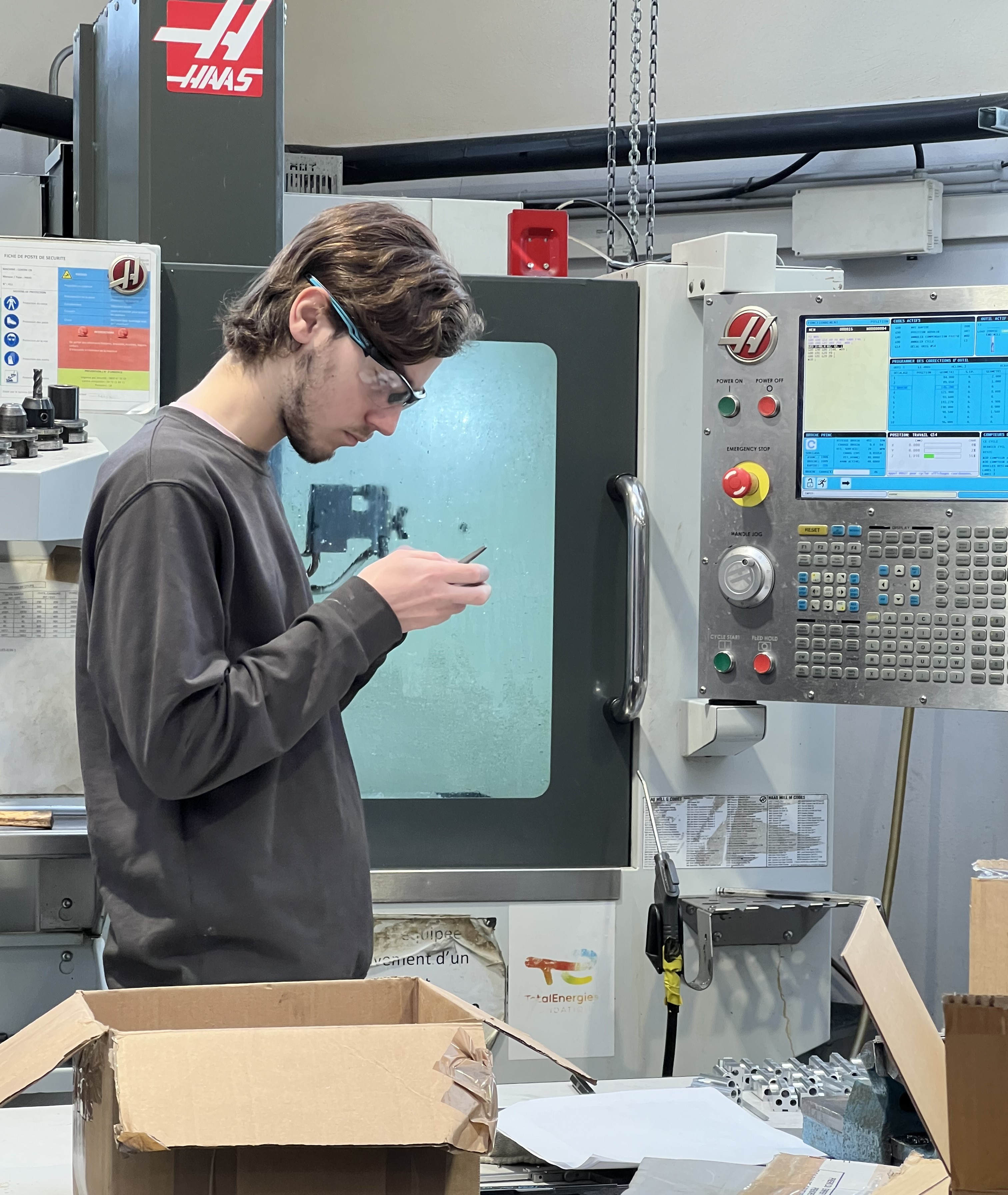 Aux commandes : 3 élèves de Terminale Bac Pro 👨🔧👩🔧 sur un centre à commande numérique, équipé d’un diviseur ⚙️